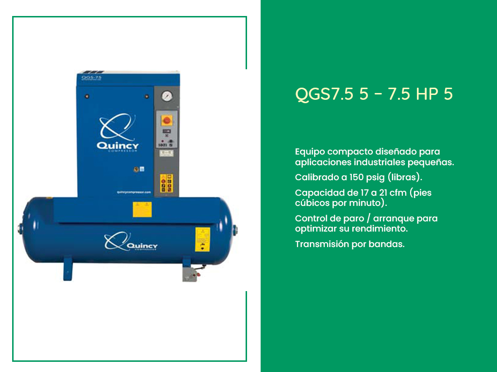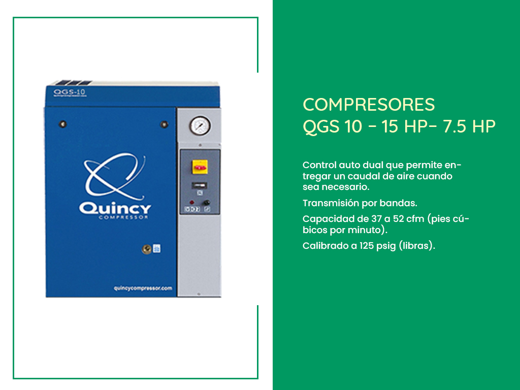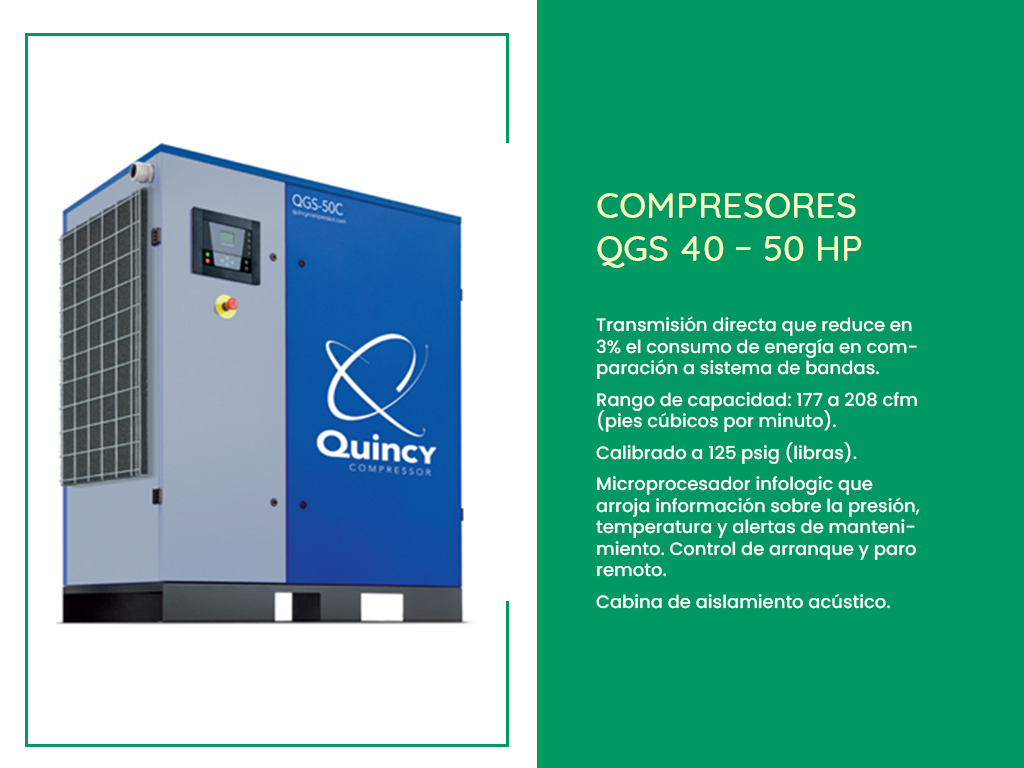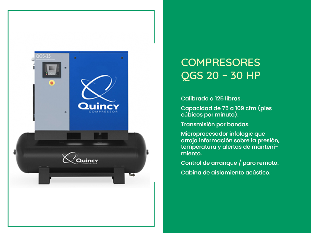Los compresores de tornillo rotativo Quincy QGS se encuentran con opciones de potencia de 5 a 100 caballos de fuerza y rango de capacidades de 17 a 100 cmf (pies cúbicos por minuto). Este tipo de compresores están pensados para diversas aplicaciones industriales con un eficiente ahorro de energía y espacios.