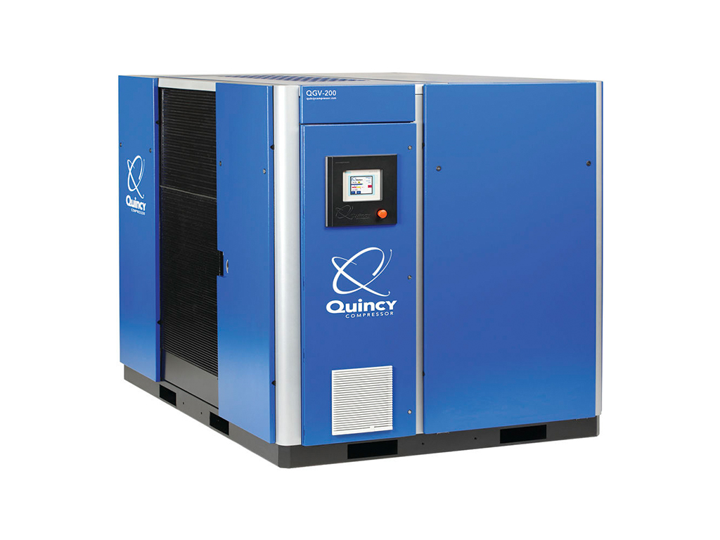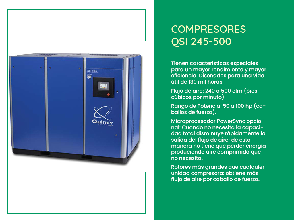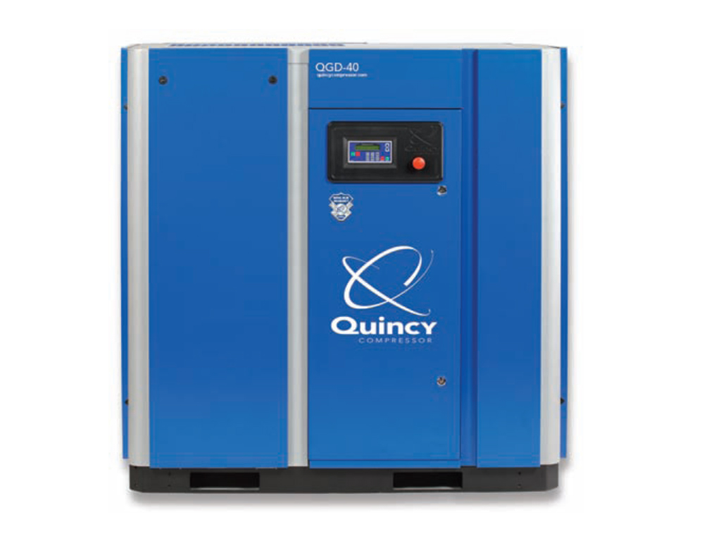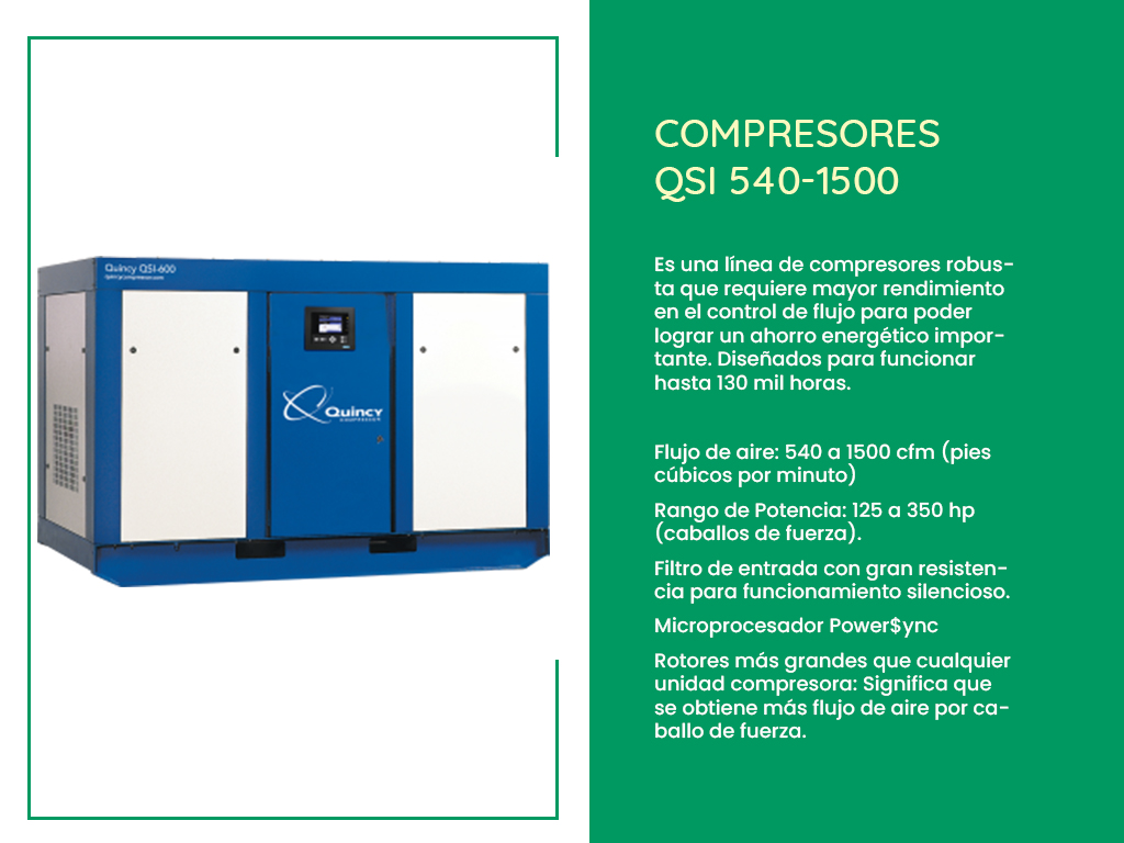 Los compresores de tornillo rotativo Quincy QGS se encuentran con opciones de potencia de 5 a 100 caballos de fuerza y rango de capacidades de 17 a 100 cmf (pies cúbicos por minuto). Este tipo de compresores están pensados para diversas aplicaciones industriales con un eficiente ahorro de energía y espacios.