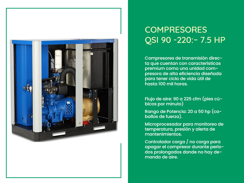 Los compresores de tornillo rotativos QSI son equipos de transmisión directa que ofrecen un flujo de aire máximo con mínimos de caballos de fuerza, además de una garantía Royal Blue por 10 años.